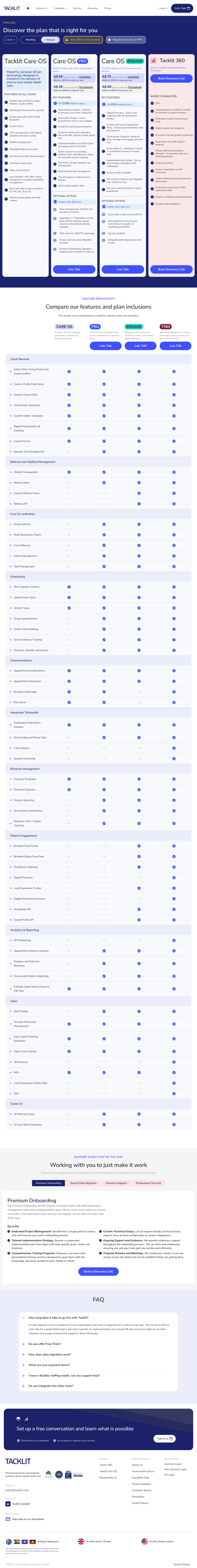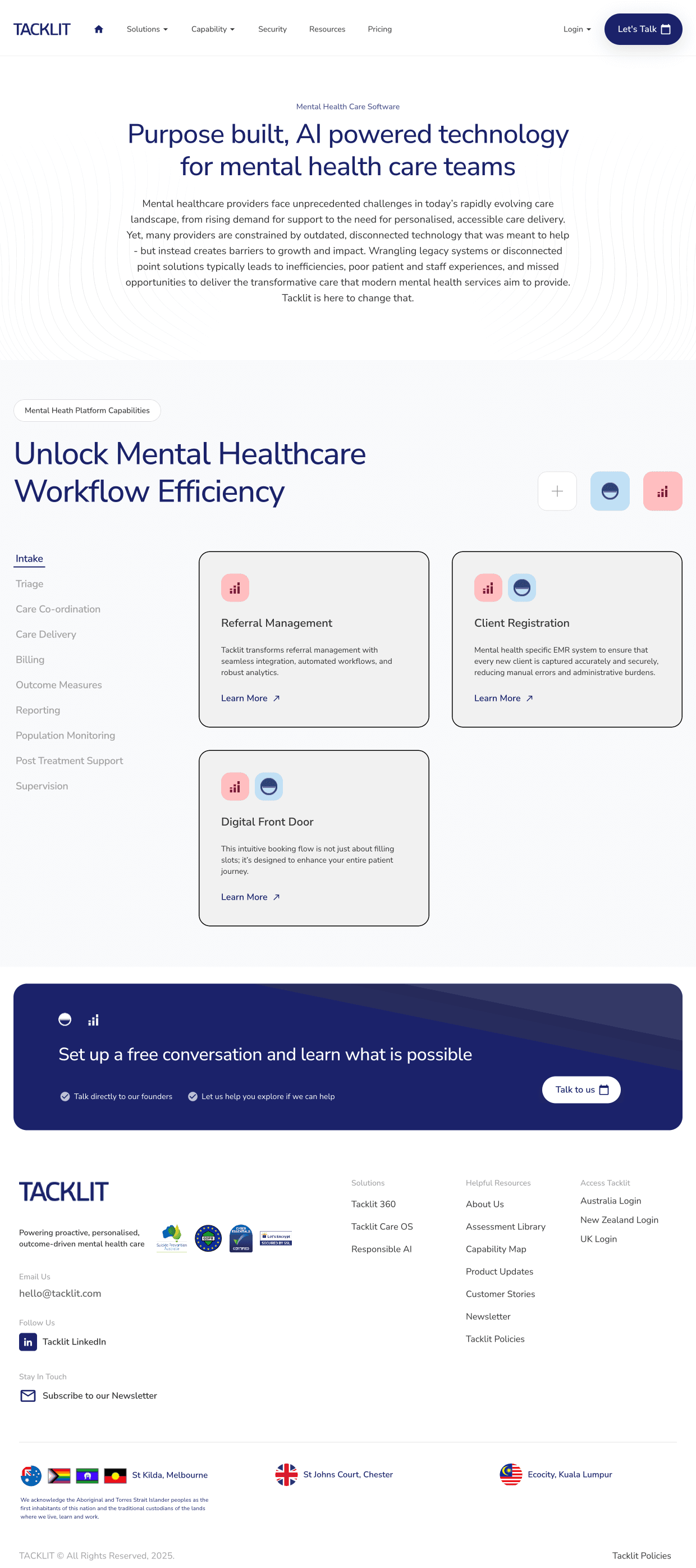 Capabilities Page: A detailed breakdown of each feature within Care OS, designed to help clinicians and decision-makers understand how Tacklit supports their daily workflows.