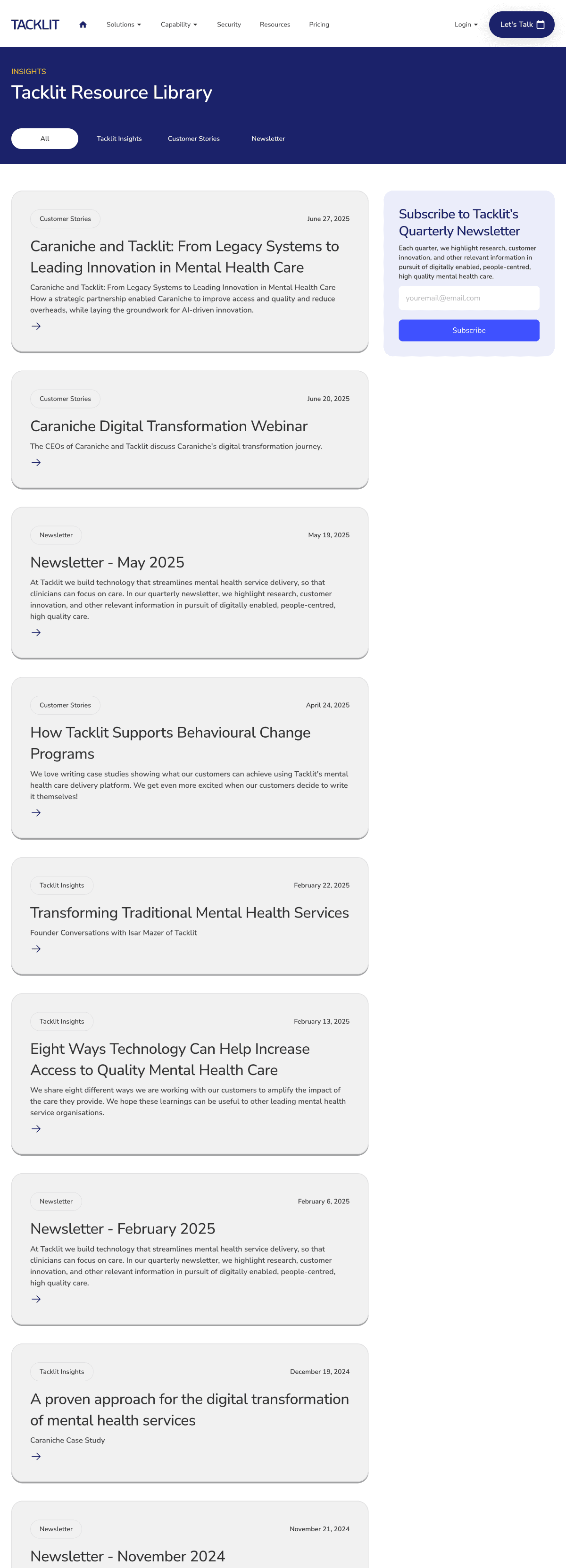 Resources Library Page: A centralized hub for downloadable guides, tutorials, video walkthroughs, and whitepapers. This section helps educate potential clients while reinforcing Tacklit’s thought leadership in the healthcare SaaS space.