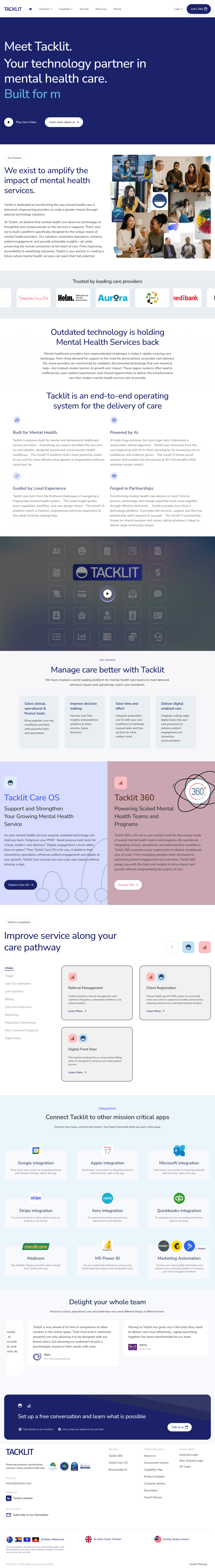 Tacklit.com is the official marketing site for Tacklit, a Care Delivery System designed to empower clinicians, psychologists, and healthcare organizations to deliver client-centered services with ease. Built on Framer, that is a major place where potential customers discover the product, learn how it works, and may decide to get started or reach out.