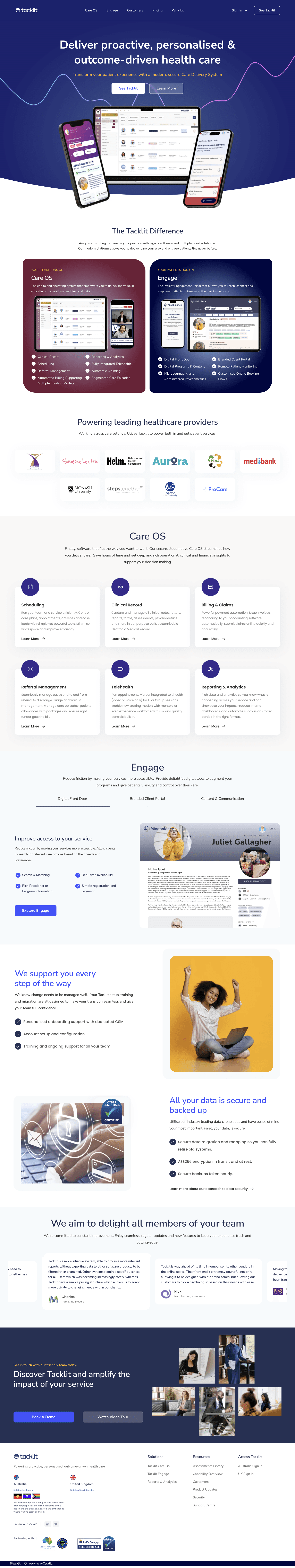 The original Tacklit.com was limited to a few essential pages: homepage, product overview (Care OS and Engage), pricing, about us, a single case study, and a basic “Book a Demo” form. While functional, the site lacked depth, clarity, and strategic storytelling—resulting in poor SEO visibility and lower conversion potential.